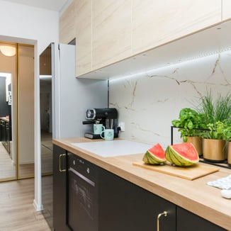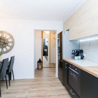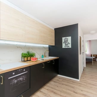 Salon z aneksem kuchennym to centralna przestrzeń mieszkania – jasna, funkcjonalna i nowocześnie urządzona. Zabudowa kuchenna została zaprojektowana z dbałością o detale, wyposażona w wysokiej klasy sprzęt AGD oraz elegancki blat. Czarne fronty szafek w połączeniu z drewnem i złotymi uchwytami tworzą stylowy kontrast, a podświetlenie LED dodaje całości nowoczesnego charakteru. Duży zegar ścienny i starannie dobrane oświetlenie sufitowe nadają wnętrzu wyjątkowy klimat – idealny do codziennego relaksu i spotkań z bliskimi.