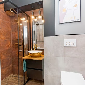 Łazienka zachwyca wyjątkowym wykończeniem – przestronna kabina prysznicowa typu walk-in z deszczownicą i złotą armaturą, nowoczesna umywalka nablatowa oraz wysokiej jakości kafle w ciepłych odcieniach sprawiają, że całość jest jednocześnie elegancka i komfortowa. Elementy w kolorze czerni i drewna podkreślają charakter wnętrza.